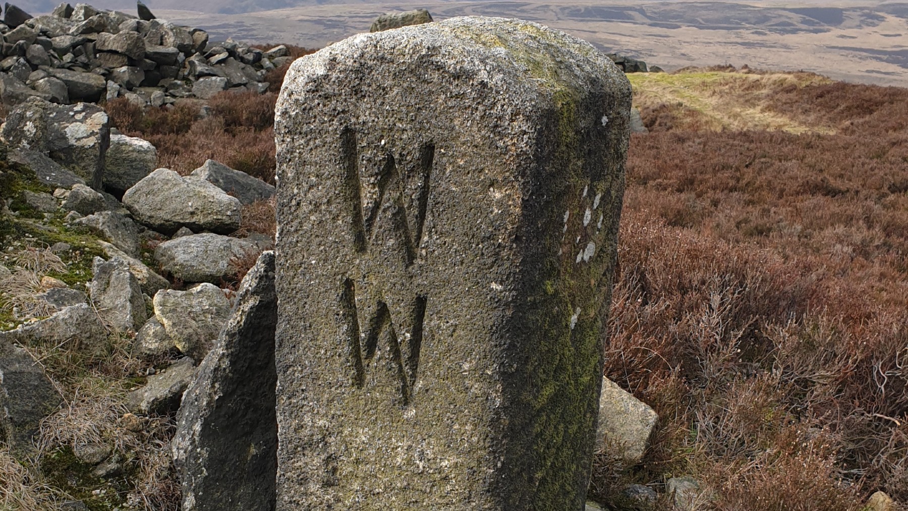The route now continues along the path on top of the edge. The edge is less popular in this area, there are fewer walkers and climbers on this northern section of the edge. Even on a busy day this north end of Stanage is still a quiet and tranquil place. Follow the top of the edge until the rock become less distinct over Stanage End. Eventually a wall is reached where the top path meets the lower path. Here are the remnants of an old quarry. Look out for two distinct marker stones with WW and WM carved on them. These indicate the boundary between shooting estates. This is the time to turn around and maybe have a coffee looking west over the northern moors of the Peak District. (2.5kms. 20m. 0hrs. 50min.)