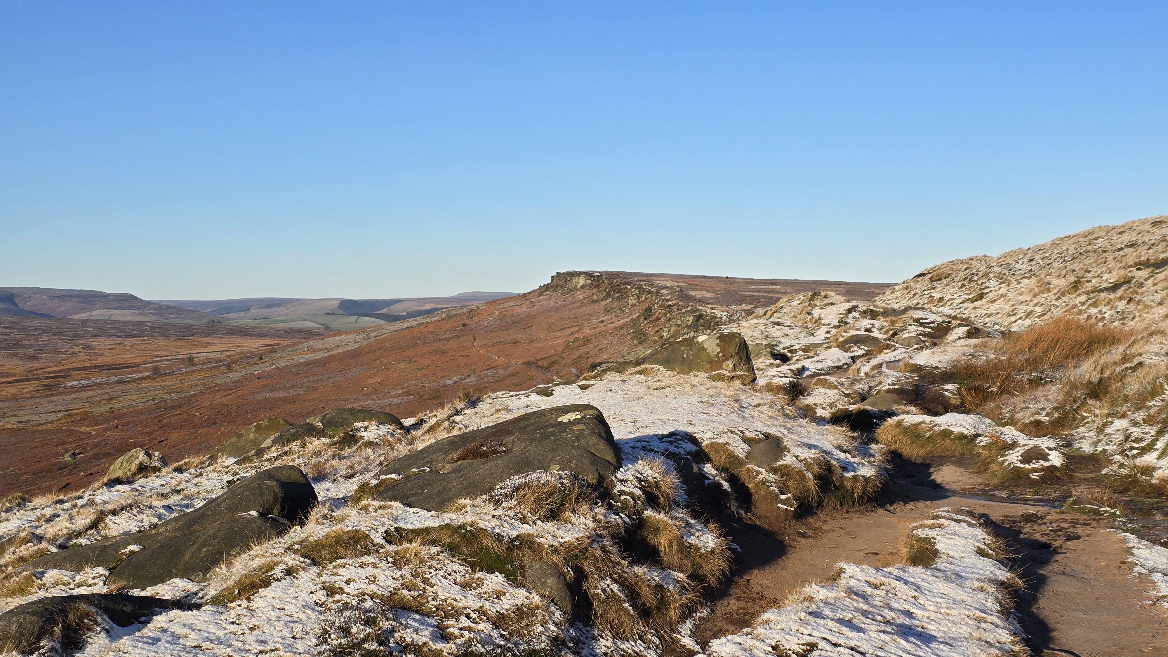 21st November 2025 Winter appeared in November 2025. A beautiful day with perfect blue sky but cold. A great walk to Stanage Pole and then onto White Path Moss, and back. Really clear with views of snow over Kinder.
