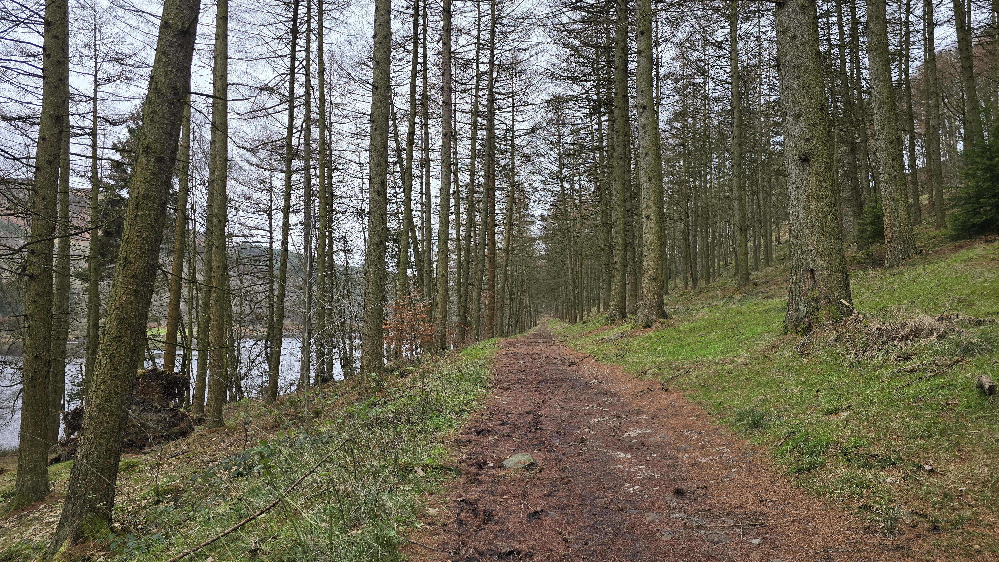 From the top of Crook Hill descend steeply to reach Crookhill Farm. The path goes around the north west of the farm buildings. Follow the path down to the road. Cross the road and follow the tracks that reach the path around the reservoir. The final part of the walk is alongside the reservoir. Follow past the aquaduct, and then onto the car park. Much of this walk is through the forest, which is thin enough to give good views over the water to the hillside. (2.5kms. 20m. 0hrs. 50min.)
